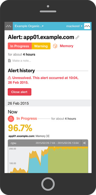 村田:モバイル用のUIも用意しているので、お手元のモバイル端末で見ることができます。出先でアラートを確認したいということありますよね。そんなときに便利です。Mackerelの画面はレスポンシブ設計になっているので、タブレットサイズの端末でもご覧になれます。