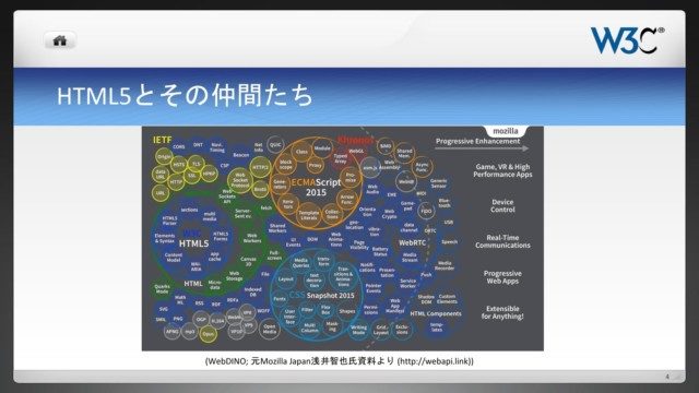 芦村: HTML5のムーブメントを経て、アプリケーションやシステム構築のための共通プラットフォームになってきました。 WebDINO Japan(元Mozilla Japan)の浅井智也さんが作った「Web曼荼羅」という図ですが、凄まじい数の仕様が、様々な団体をまたがって策定されているのがおわかりかと思います。