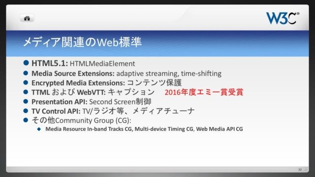 それらを補うために、Media Source Extensions (MSE)やEncrypted Media Extensions (EME) といった仕様も既にありますし、字幕などを実現するためのフォーマットであるTTMLやWebVTT、セカンドスクリーン制御用のPresentation APIなどもあります。