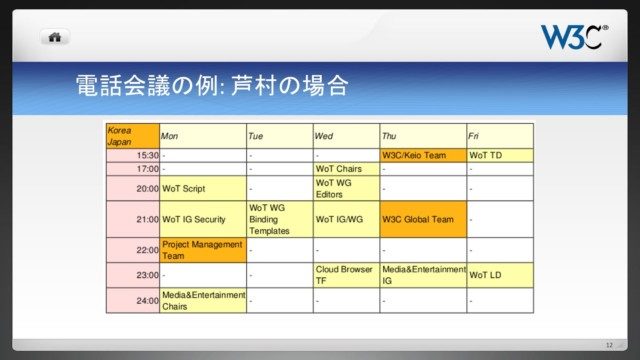仕様書を策定するのはワーキンググループの役割で、その間のコミュニケーションを円滑にするのが私たちの重要な仕事の一つです。 電話会議を実施して議事録を取ったり、メーリングリストやGitHubで行われる議論をウォッチしたり。ちなみに私の電話会議のスケジュールはこんな感じです。