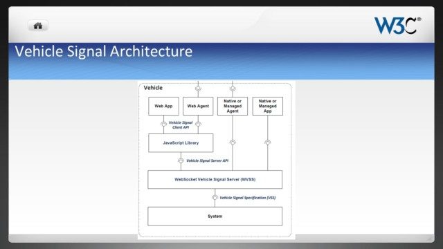 芦村: で、実際の車載システムとのコミュニケーションは、WebSocketを利用する仕様が提案されています。Vehicle Signal Architectureの図を見ると全体像が把握できるかと思います。